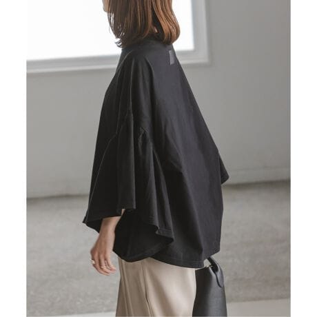 直線的な四角いボディに大きな四角の布をギャザーを寄せて身頃に縫い付けたことで、スクエアパターンからは予想を裏切るフェミニンなシルエットのTシャツに。