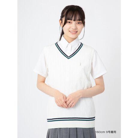 暑い季節にも快適な、高機能ハイゲージニット。襟・裾に配色ライン入り。トラッドなケーブル柄の薄手で軽やかな夏用のベストです。ほどよいVネックの開きはシャツとの相性もよく、リボン・ネクタイとのバランスもきれいに決まります。クールマックスは汗を素早く吸収・放出する高機能素材。乾燥速度が早く、快適な着心地をキープします。左胸にシルバーの女神刺繍入り。