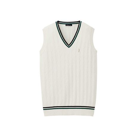 暑い季節にも快適な、高機能ハイゲージニット。襟・裾に配色ライン入り。トラッドなケーブル柄の薄手で軽やかな夏用のベストです。ほどよいVネックの開きはシャツとの相性もよく、リボン・ネクタイとのバランスもきれいに決まります。クールマックスは汗を素早く吸収・放出する高機能素材。乾燥速度が早く、快適な着心地をキープします。左胸にシルバーの女神刺繍入り。