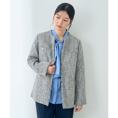 首元やフロント、袖に施したフリンジが上品なツイードジャケット。