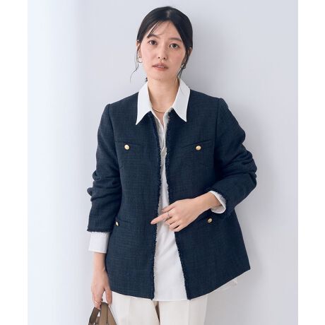 首元やフロント、袖に施したフリンジが上品なツイードジャケット。