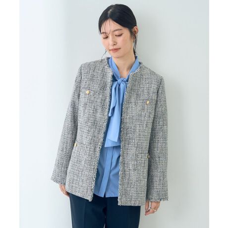 首元やフロント、袖に施したフリンジが上品なツイードジャケット。
