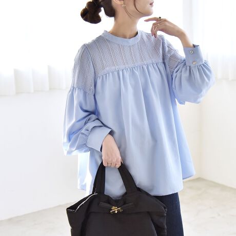 肩から上のレース切り替えがエレガントな雰囲気のスタンドカラーブラウス。