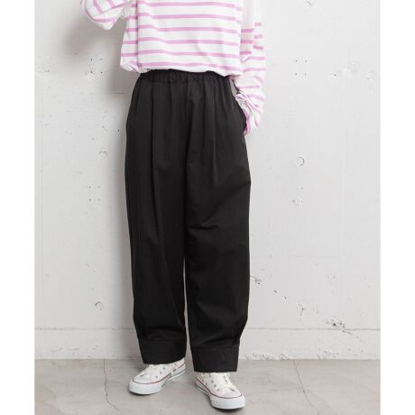裾をまとめてタックを入れた、立体感のあるコクーンシルエットが特徴的なパンツ。ヒップから太もも周りはゆったりとさせ、裾に向かってやや少し細くなるシルエットで、脚のラインを拾わずに足首を細く見せてくれます。微光沢のコットンポリエステルツイル素材を使用、カジュアルにもきれいめにも着られます。ウエストはぐるりゴムで内紐つき。両サイドポケット付き。