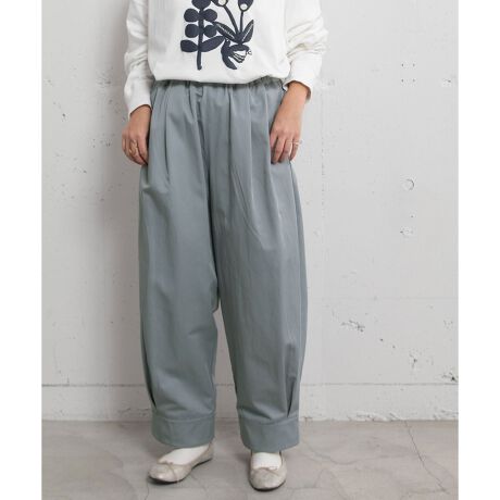 裾をまとめてタックを入れた、立体感のあるコクーンシルエットが特徴的なパンツ。ヒップから太もも周りはゆったりとさせ、裾に向かってやや少し細くなるシルエットで、脚のラインを拾わずに足首を細く見せてくれます。微光沢のコットンポリエステルツイル素材を使用、カジュアルにもきれいめにも着られます。ウエストはぐるりゴムで内紐つき。両サイドポケット付き。