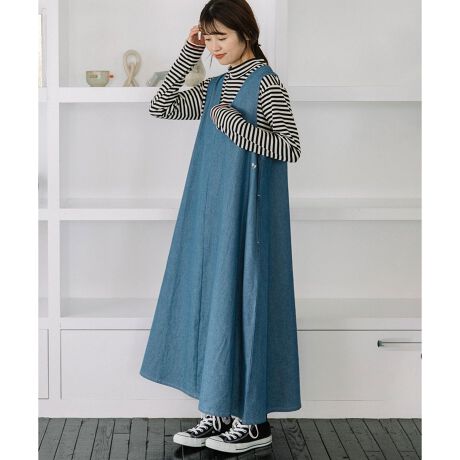 <made in INDIA>ライトオンスデニムで仕立てたフレアシルエットのワンピース。前後のVネックとスクエアネックのどちらでも着られる2WAYの仕様です。片側ポケット付近に花モチーフの刺繍を入れました。インナー次第でロングシーズン着まわせます。両サイドにポケット付き。