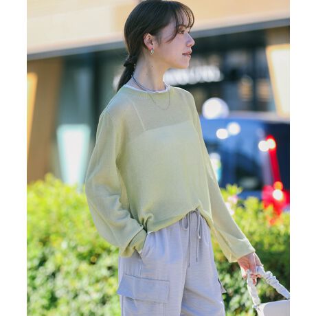 さらっとした長袖のニットに、レイヤード風のハイショクデザインがトレンドのアイテム。袖先、袖口、裾とハイショクデザインがチラ見えするのがさりげないアクセントに。シンプルなデザインですが、ショート丈でシアー素材の1枚着てさまになるニットです。