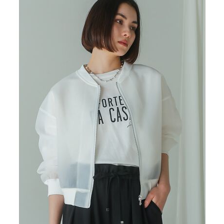 シアーダンボール素材は、今期注目のトレンドアイテム!!軽やかで通気性が良く、ほんのり透け感があるので、インナーの選び方次第で、カジュアルにもエレガントにも雰囲気が変化します。レイヤードスタイルを楽しむのにもぴったりの素材です。特に、季節の変わり目に最適なアイテム!ファスナー部分はメタル素材で、ミニマルなデザインは少しエッジがきいています。