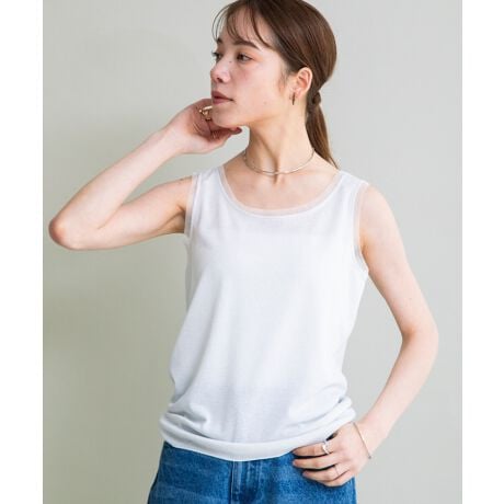 上品なシルバーラメが施された、トレンド感たっぷりのラメカットソーインナー。しっかりとストレッチもあり、ネックの開きにもこだわり前後2WAYで着用可能。コーデに合わせてお選び頂けます。衿ぐりとアームホールにチュールを挟み込み、さりげないディティール使いもポイント。これから夏にかけても着用できる薄手素材で長くお使い頂けます。