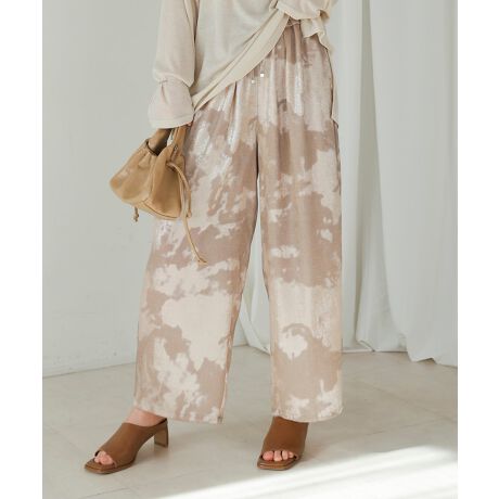 水彩タッチなシャイニー柄がインパクトのあるリラクシーなパンツ。広がりすぎずにすとんと落ちるセミワイドシルエット。お手持ちのシャツやニットに合わせるだけで、旬コーデにアップデートする春一押しのアイテムです。ウエストのフリルがワンポイント。ウエストオールゴムでストレスフリー。紐付きでウエスト調整可能です。