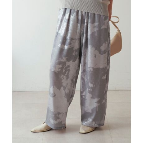 水彩タッチなシャイニー柄がインパクトのあるリラクシーなパンツ。広がりすぎずにすとんと落ちるセミワイドシルエット。お手持ちのシャツやニットに合わせるだけで、旬コーデにアップデートする春一押しのアイテムです。ウエストのフリルがワンポイント。ウエストオールゴムでストレスフリー。紐付きでウエスト調整可能です。