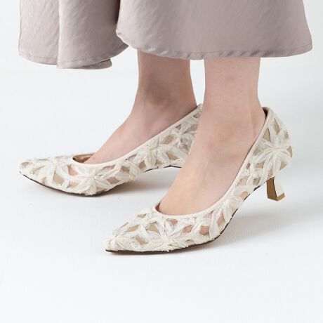 ふんわり表情豊かにフェザーライクなフリンジで立体的に表現したフラワーモチーフが目を引くパンプス。