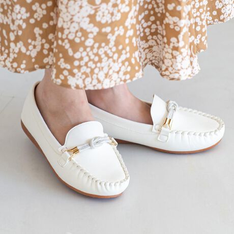 メタリック素材を使用したロープで作ったビットをあしらったモカシンシューズ。