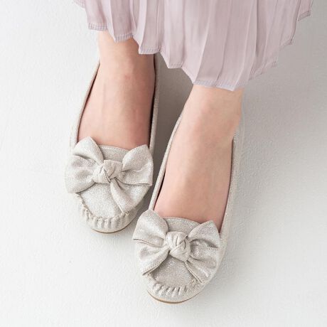大きめのふわっとリボンが目を引くモカシンシューズ。