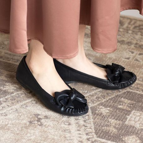 大きめのふわっとリボンが目を引くモカシンシューズ。