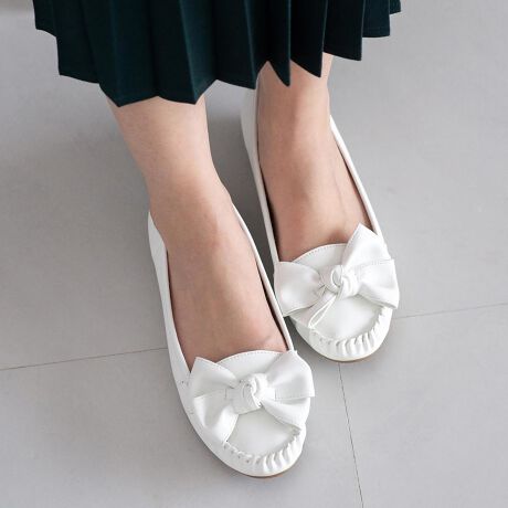 大きめのふわっとリボンが目を引くモカシンシューズ。