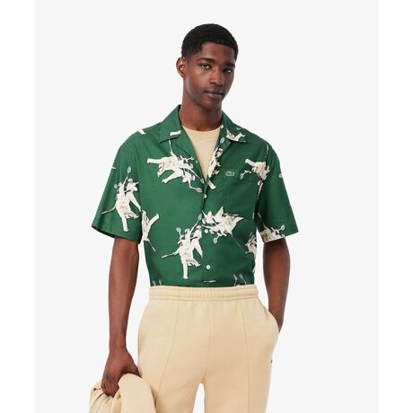 [型番:CH0113-10]今季のアイコンテキスタイルをあしらったオープンカラーシャツ・環境保全に配慮したオーガニックコットン仕立てのツイル素材・春夏の季節感を演出するオープンカラーデザイン・ヌケ感を演出するボックスシルエットのリラックスフィット・現役時代のルネ・ラコステをモチーフにした今季アイコンテキスタイルを全身にRelaxed Fit