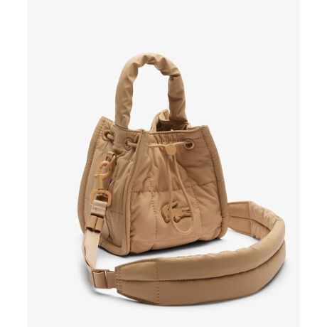 ワントーンのカラーリングがモダンで都会的な表情を見せるスクエア型バケットショルダーバッグ。リサイクル仕立ての中綿キルティング素材を使用し、同色ながら存在感を放つメタルワニロゴバッジをあしらったスマートなデザインが魅力。スタイリッシュなドローコードを施した巾着式クロージャーは使い勝手も抜群です。