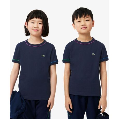 [型番:TJ8431-10]クレイジーカラーの配色パイピングがポップなキッズTシャツ・環境保全に配慮したオーガニックコットン仕立てのシングルジャージ素材・シンプルなワンポイントデザインに際立つクレイジーカラーの配色パイピング・リサイクル仕立てのワニロゴパッチ