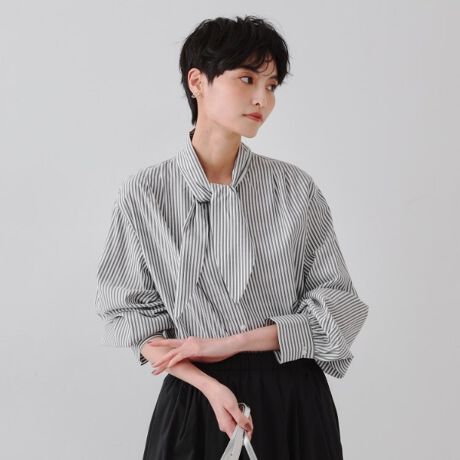 ・首元のボウタイデザインが目を惹くストライプシャツです。