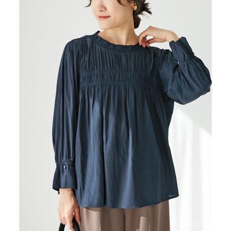 フロントのシャーリングとスリットの入ったカフスがポイントになった、1枚で着映えするデザイン。