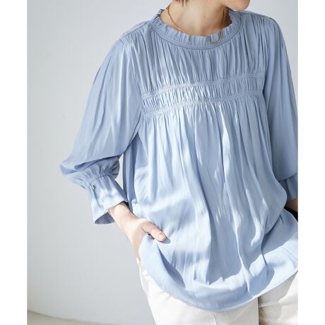 衿元もシャーリングののデザインで、ネックからショルダーにかけてあしらったギャザーが華やかな印象です。スッキリとした袖口カフスで甘くなりすぎずに着ていただけます。素材は人気のパウダーサテンを使用。