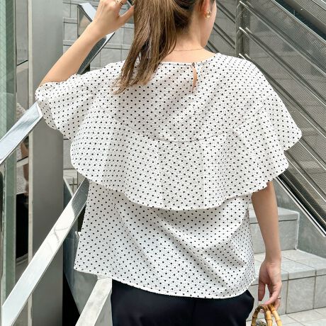 ・バックフリルが華やかなドット柄の半袖ブラウス
