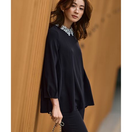 名品ジョーゼット地にヴィンテージライクなレース襟がアクセントになったブラウス。レース襟は取り外し可能な2WAY仕様です。レース襟を外すと洗練されたシンプルな印象に、レース襟をつけると華やかなで上品な印象でご着用いただけます。また、ゆるやかなペプラムシルエットが大人かわいいを叶えてくれます。同素材のフルレングスパンツ(品番: PR23CS0003)やテーパードパンツ(品番: PR23SS0002)とセットアップでの着用がオススメです。普段使いはもちろん、セレモニーや家族行事、七五三、ビジネスなどのきちんとしたシーンにも対応可能。構築的なフォルムが凛とした甘さ演出してくれるので、お仕事シーンにも活躍してくれること間違いなしでです。カラーは明るくやさしいベージュ(#033)、合わせやすく落ち着いたネイビー(#075)の2色展開です。
