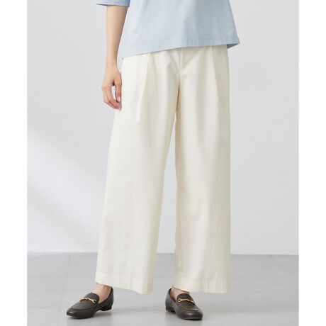 ■デザインタック入りのワイドパンツ。フロントタックは広がり過ぎないようウエスト下に内縫いを入れ、すっきりとしたシルエットのワイドストレートに仕上げました。ウエストゴムは、後ろは多め、前は少なめで、ぐるり一周ゴム入りですがフロントファスナー開きのデザインはキープしたままなので、トップスをインしてもキレイ目に着こなせます。ホワイト(#001)のみ裏地付きです。
