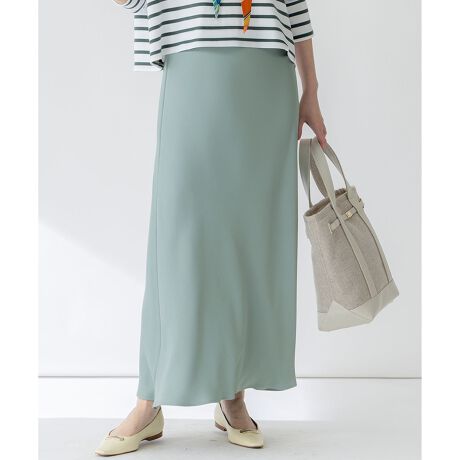 ややIラインの落ち感のあるスカート。程よい肉感で体に張り付かず、女性らしいシルエットを作り出してくれます。ウエスト部分はオールゴムで着脱しやすいのも嬉しいポイント。前側のゴムはスッキリと見えるように作っており、トップスをインしてもごわつきにくいように仕上げています。光沢のあるサテンがどんなトップスに合わせてもこなれた印象に。オンオフ問わず着用していただけます。カラーは、柔らかく馴染むベージュ(#033)、シックな印象のブラック(#005)、春らしい清涼感のあるミント(#062)の3色展開です。