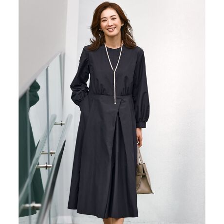 多彩なタック使いで360度美しいがエレガントなシルエットを描いたワンピース。トップス部分はジャケットとも合わせやすくシンプルに、スカート部分の斜めにイレギュラータックを入れ分量感をもたせることで、ラインをスタイリッシュに見せてくれるフィット&フレアシルエットに仕立てています。特に後ろ姿が美しく見えるようにこだわったシルエット。袖口のギャザー内側にはシャーリングゴムをあしらい、袖をたくし上げやすく、腕をまくっても袖コンシャスなデザインです。同コラボアイテムのノーカラージャケットとの組み合わせもおすすめです。式典や記念日はもちろん、お仕事や学校行事などにも最適な、その後の毎日にも寄り添ってくれる1枚です。カラーは、上品さと洒落感を両立した優しげで清楚な淡色ライトなベージュ(#033)、きちんと感が増す気品のあるネイビー(#075)の2色展開です。