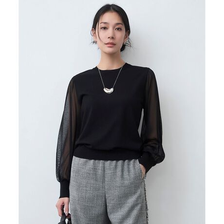 ■デザインシアースリーブが優美な印象のコンビネーションニットです。優しくふんわりとした量感のある袖も袖口リブで締めることで、シルエットにコントラストが生まれモードな印象に。ジャケットのインナーとしても、セレモニーシーンにもお使いいただけます。