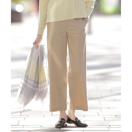 ■デザイン程良いワイドパンツで、大人なリラックス感のあるパンツ。後ろのウエスト部分はゴム仕様のため大変履きやすく、ストレッチ性もあるので動きやすいです。脇のポケット部分に並んだ飾りボタンがポイント。合わせるアイテムによって、シンプルからきれいめなスタイリングまで幅広く対応する、大人のベーシックアイテムです。裏地なしです。
