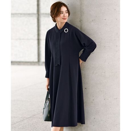知的な美しさを演出する、つけ襟付きボウタイワンピース