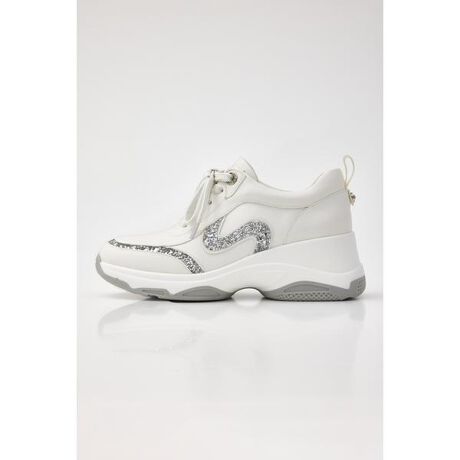 [型番:350IS149-9110]脚長効果も絶大な、スタイリッシュな足元に魅せてくれるハイヒールスニーカー。スマートなフォルムに程よくデザインきいた流れるようなグリッターラインもアクセント。見た目以上に高低差を感じにくく軽快に履いていただけます。オフィスカジュアルにも◎