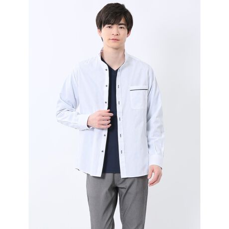 綺麗目なルックスに仕上げた、スタンドカラーの長袖シャツです。下前立・ポケット部分の別生地切り替えでアクセントを効かせています。裾部分はラウンドカットなので、タックインとタックアウト、双方の着こなしを楽しめます。