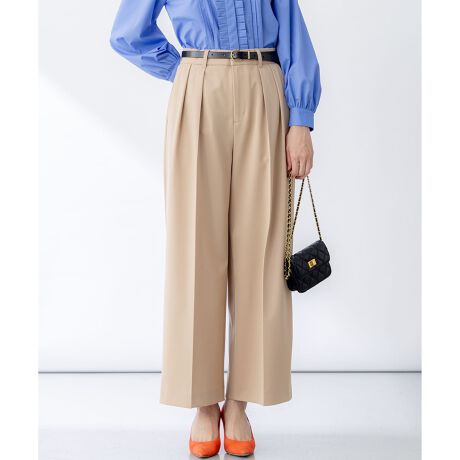 ■デザインウエストに入った2タックのワイドパンツは、タックとセンタープレスの繋がりにこだわった美しい縦ラインのトレンド感のあるワイドシルエットです。腰回りにゆとりを持たせスタイルアップ見えと着心地の良さを兼ね備えています。ウエストは後ろ部分にゴムを施したデザインのためストレスなくフィットし、フロントはファスナー仕様なのでトップスインもすっきりと決まります。太すぎないきれい見えシルエットは、デイリーからオフィスまで幅広いシーンで活躍すること間違いなしの一着です。裏地はございません。