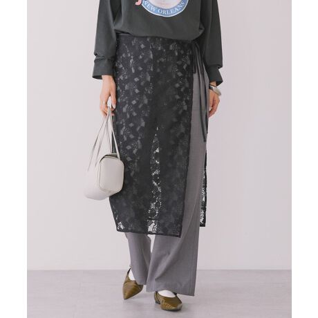 プラスワンで旬なスタイリングが決まるラップレーススカート。ウエスト紐には微光沢のあるサテン素材を使用し、上品な雰囲気に仕上げました。華やかに透けるフラワーモチーフに煌めくラメが目を惹くアクセントに。パンツの上からレイヤードするだけでワンランク上の着こなしが叶うおすすめのアイテムです。透け感[あり]