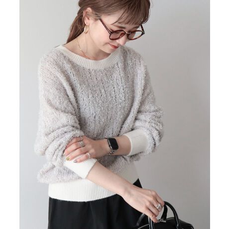 表情豊かなテープヤーンがスタイリングに映えるニットプルオーバー。襟、袖口、ヘムラインの配色リブ切り替えがアクセントになっています。横長に広がったネックラインが顔周りをすっきり魅せてくれるのも嬉しいポイント。ゆったりとしたルーズシルエットにライトな着用感でカジュアルに着こなして頂けるおすすめのアイテムです。透け感[あり]