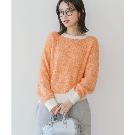 表情豊かなテープヤーンがスタイリングに映えるニットプルオーバー。襟、袖口、ヘムラインの配色リブ切り替えがアクセントになっています。横長に広がったネックラインが顔周りをすっきり魅せてくれるのも嬉しいポイント。ゆったりとしたルーズシルエットにライトな着用感でカジュアルに着こなして頂けるおすすめのアイテムです。透け感[あり]