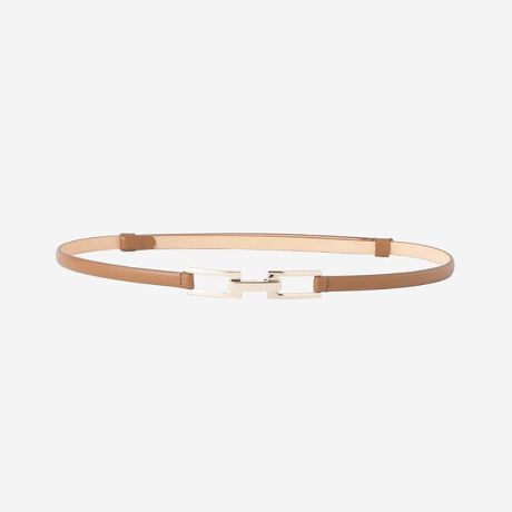 チェーンを連ねたようなスクエア型のビット金具がポイントの細ベルトです。キズがつきにくいサフィアーノ型押レザーを使用しています。金具のフックをもう一方の角カンにひっかけて着用できます。背後のレザーをスライドさせて自由にサイズ調節出来るので、ワンピース、スカート、パンツやアウター、ストールの上からなど様々なスタイルに合わせやすい便利なベルトになっています。