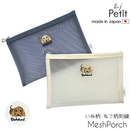 ダックスフンド柄の刺繍が入った メッシュポーチ。