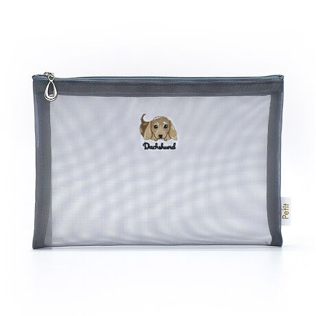 ダックスフンド柄の刺繍が入った メッシュポーチ。