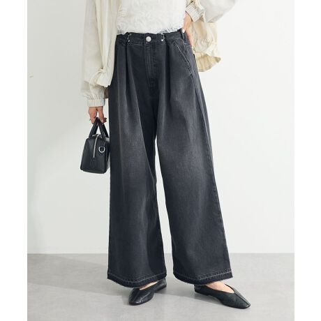 ホックディテールで立体感が生まれる定番人気のデニムパンツ。コットン100%素材で仕立てたワイドなシルエットはゆったりと快適な履き心地を叶えます。ウエスト後ろゴム仕様で着脱が簡単なのも嬉しいポイント。Tシャツはもちろん、シャツやブラウスと合わせたきれいめカジュアルスタイルもおすすめです。透け感[なし]