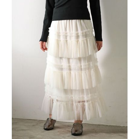 幅の違うフリルをティアードした存在感たっぷりのデザインチュールスカート。ボリュームシルエットながらも、短めの裏地で透け感のある足元が軽やかな印象を残します。ウエストは総ゴム仕様で締めつけのない快適な履き心地。カットソーやニットを合わせた春の着こなしがおすすめです。透け感[なし]