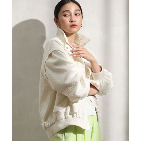 シワ加工を施したジャカード素材のデザインブルゾン。フロントジップにスタンドカラーでスポーティーカジュアルな印象です。ワイドなフォルムでインナーを選ばず、袖を外してベストとしても合わせていただける2WAY仕様。ワークテイストなボリュームあるアウトポケットも今年風のアクセントです。ロングシーズンで活躍してくれるおすすめのアイテム。透け感[なし]