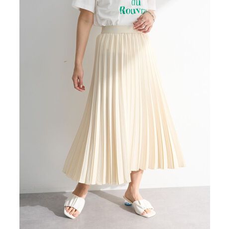 裾に向かって上品に広がるAラインシルエットが魅力のプリーツスカート。プリーツの縦長ラインがすっきり見えを演出してくれます。美しいツヤ感のツイル素材はシワになりにくく、サラッとした肌触りなのも嬉しいポイント。ウエストゴム仕様で穿きやすく、快適性とファッション性を兼ね備えた優秀アイテムです。透け感[ややあり]