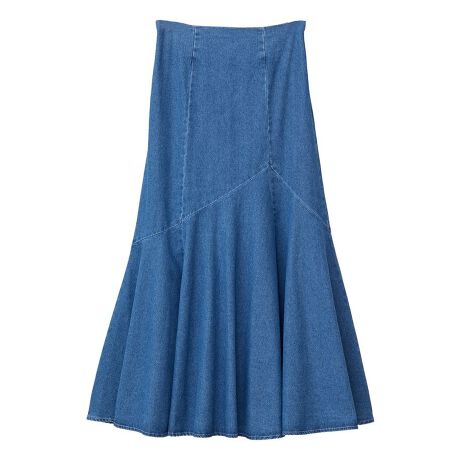 アシンメトリーの切り替えラインが特徴的なデニムスカート。膝下から広がる女性らしいマーメイドラインで、ウエスト周りをすっきりさせたスタイリッシュな1枚です。柔らかなデニム生地で着用感も軽くウエスト後ろゴム仕様で穿き心地も快適。カジュアルにもきれいめにも合わせられ、シーズンレスに楽しめるおすすめなアイテムです。透け感[なし]