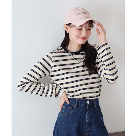 細めのボーダー柄とリブ仕様のネックデザインで、シンプルながらも洗練された印象をプラス。