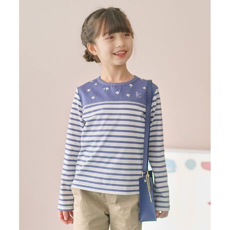【110-140cm】フラワー刺繍ボーダー Tシャツ